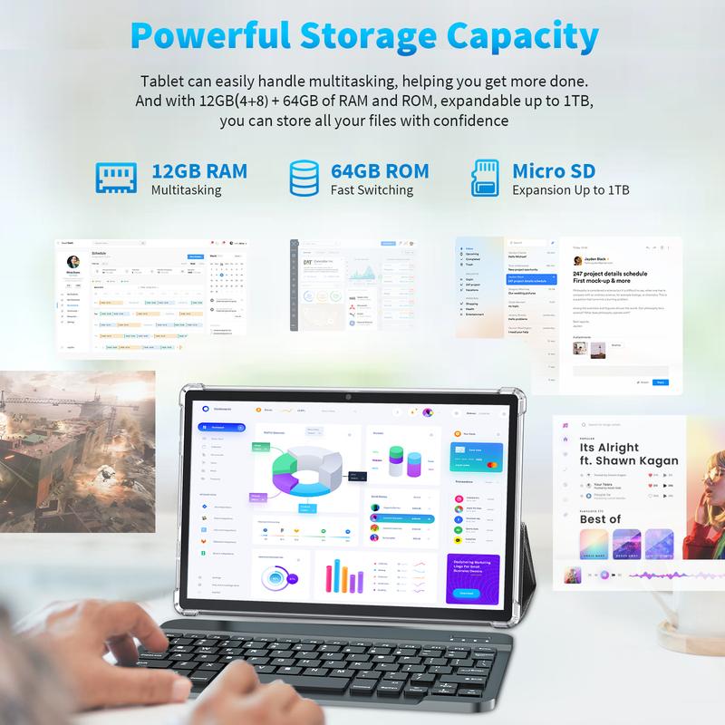 ·【12GB RAM(4GB+8GB) + 64GB ROM + 1TB Expandable】The Android 14 tablet is equipped with 12GB RAM 64GB ROM large-capacity storage, supports 1TB expansion(card not included)
